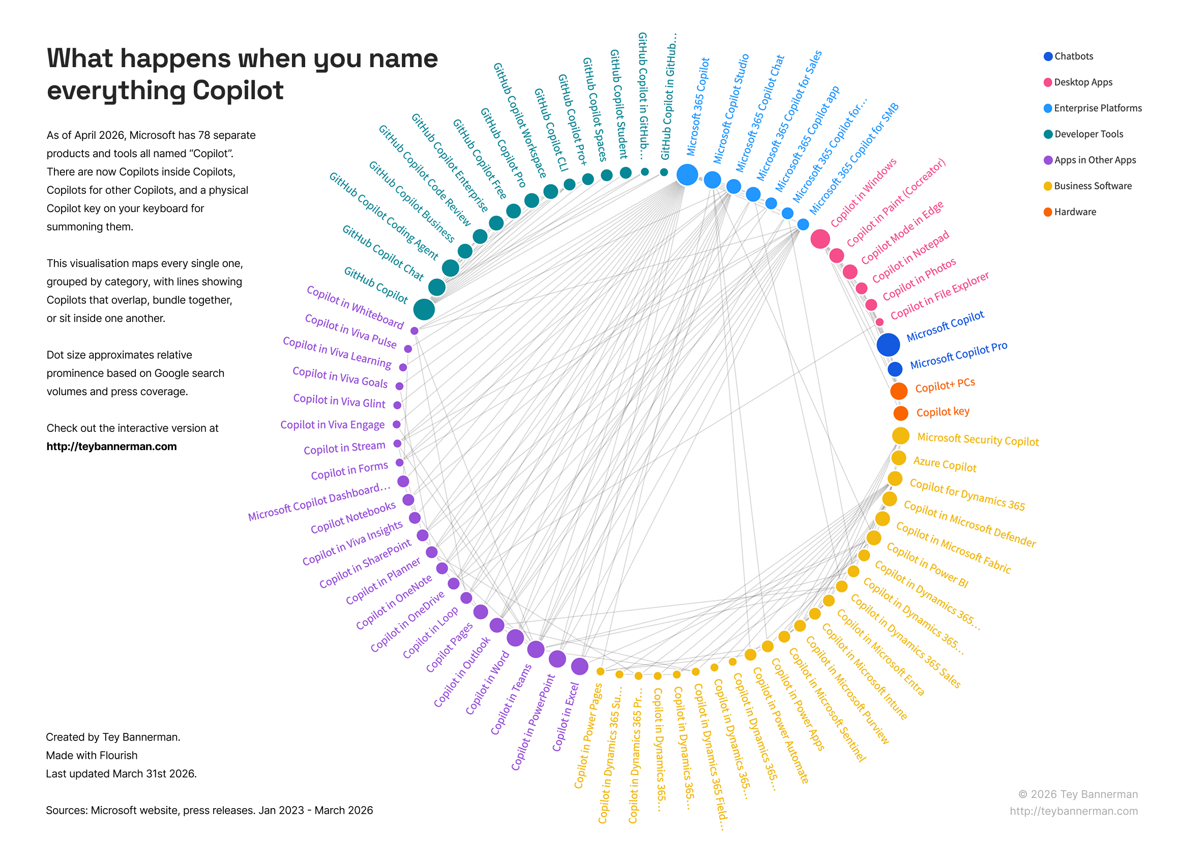 (teybannerman.com)- ‘Copilot’ 명칭이 75개 이상 제품과 기능에 사용되며, 앱·플랫폼·키보드 키·노트북 카테고리 등 다양한 형태로 확장됨